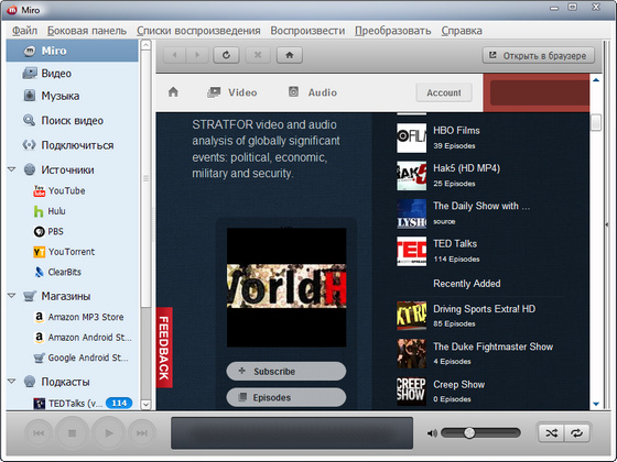 Miro - медиаплеер, основное предназначение которого - облегчение просмотра видео в Интернете. Плеер позволяет подключаться к видео-каналам, загружать видео-файлы на компьютер, просматривать ролики в полноэкранном режиме и т.д. Miro прост в работе и абсолютно бесплатен. Смотрите практически любое видео - Quicktime, WMV, MPEG, AVI, XVID и другие форматы. Просматривайте свою коллекцию, делайте плейлисты, сохраняйте порядок. Подписывайтесь на любые потоки RSS, содержащие видео, подкасты или видеоблоги. Исследуйте сотни свободных каналов при помощи встроенной программы передач.