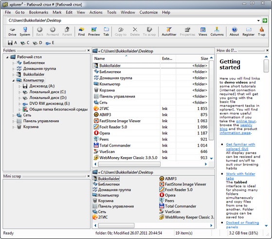 Для удобства и быстрого открытия какого-либо файла или каталога, можно поставить закладку. Встроенные средства этого менеджера позволяют просматривать графику, предварительно прослушивать аудио и просматривать видео файлы, а также файлы форматов HTML, Text, RTF и Hex. xplorer2 можно рекомендовать для работы и компьютерным новичкам, и пользователям, имеющим большой опыт.