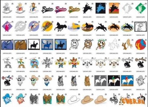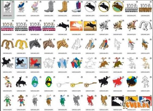 216 объектов в EPS формате на тему ковбоев, лошадей и родео