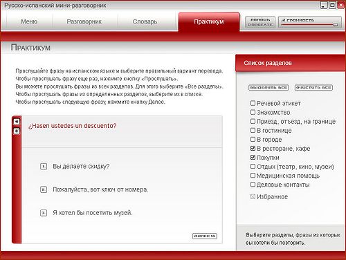 Около 1 500 озвученных фраз и слов, содержащихся в нем, помогут объясниться в самых распространенных и типичных ситуациях: в самолете и поезде, на границе, в гостинице, ресторане, магазине и т. д. Есть возможность прослушать звучание фраз, сравнить свое произношение с эталоном и сформировать собственный рабочий словарь самых нужных выражений.