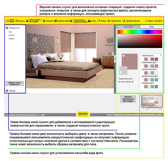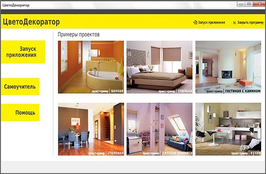 Мультимедийный продукт был создан для самостоятельного подбора цветовых решений стен и полов с применением различных материалов. Главной функциональной особенностью является создание цветных проектов на основе цифровых фото или компьютерных визуализаций проектируемых помещений. Инсталляция не требуется, авторы приложили все усилия, чтобы программа работала корректно на всех компьютерах нашего рынка.