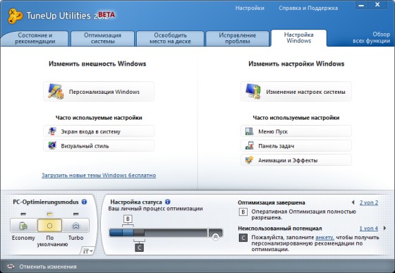 TuneUp Utilities предлагают Вам два новых метода оптимизации, которые гарантируют оптимальную работоспособность даже при высокой загруженности компьютера. В случае необходимости, быстродействие будет увеличено или ускорится процесс запуска программы.