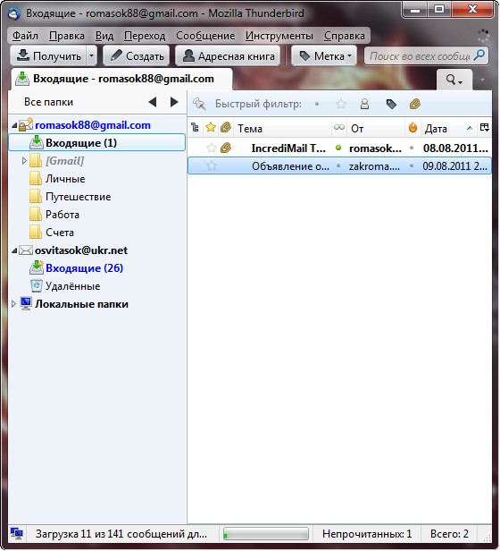 Thunderbird - простая и удобная бесплатная программа для работы с электронной почтой от Mozilla. Программа поддерживает протоколы SMTP, POP3, IMAP и RSS. Имеет встроенный HTML редактор, который создает довольно компактный код, что в свою очередь уменьшает итоговый размер отправляемых писем в несколько раз. Поддерживает всевозможные кодировки, расширяется за счет дополнительных модулей и фильтрует рекламу, а так же нежелательную корреспонденцию. Интерфейс программы основан на технологии XUL, разработанной Mozilla Foundation, в результате чего интерфейс на всех платформах выглядит так же, как у приложений, разработанных для этой конкретной платформы. Интерфейс программы прост и удобен в использовании, поддерживает смену скинов. Во второй версии программы включено множество новых возможностей, помогающих вам лучше управляться с бурным потоком информации, устремляющимся в ваш почтовый ящик и быть в курсе последних событий.