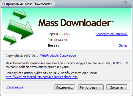 MetaProducts Mass Downloader - программа для удобного скачивания файлов из Интернета по протоколам HTTP и FTP, созданная на базе Offline Browser, разница только в том, что менеджер закачки загружает указанные пользователем файлы, а оффлайн-браузер - все файлы сайта. Программа разбивает закачиваемый файл на части и качает все части одного файла одновременно, тем самым увеличивая скорость. Может автоматически соединиться с провайдером, закачать файл и отключиться. Также позволяет докачивать файл после разрыва соединения (при условии, что сервер поддерживает докачку). Поддерживаемые протоколы HTTP, FTP, HTTPS, RTSP, MMS и MMST. Имеется интеграция с веб браузерами Internet Explorer, Opera, Netscape Navigator, Mozilla, Firefox, Seamonkey и Flock. Программа имеет многоязычный интерфейс, включая русский язык и поддерживает работу с Windows Se7en.