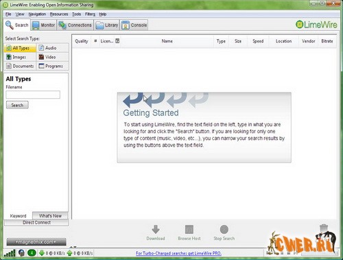 LimeWire - программа, предназначенная для обмена файлами между пользователями. LimeWire отличается от программ аналогичного назначения тем, что совместима практически со всеми P2P сетями. Если вы не знакомы с этой программой, то, чтобы её освоить, вам придется приложить некоторые усилия. Зато после её освоения вы сможете начать поиск и скачивание интересующего файла в бескрайних просторах интернета.