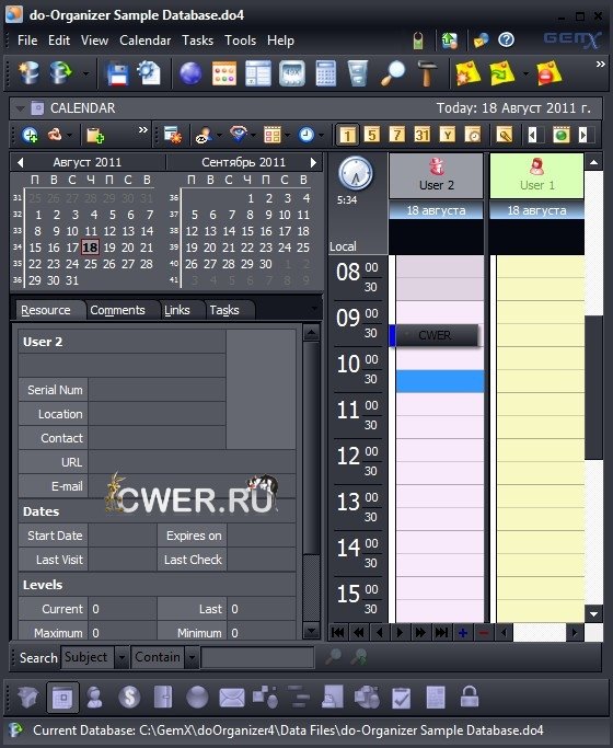 - Resources - база данных для учета пользователей органайзера. Имеет возможность распределять задания между пользователями системы, парольная защита данных и т. п.