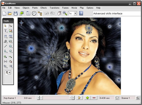 KoolMoves - программа для создания анимационных эффектов в формате Macromedia Flash (.SWF) и кадров для анимированных GIF-файлов и анимации в других популярных форматах. В программе имеется: инструментарий для рисования объектов различной формы, импорт векторной графики, добавление звуковых файлов, множество различных эффектов, в том числе текстовые эффекты, добавление действий к тексту и кадрам. Программа также имеет готовые шаблоны, библиотеку кнопок и векторных заготовок.