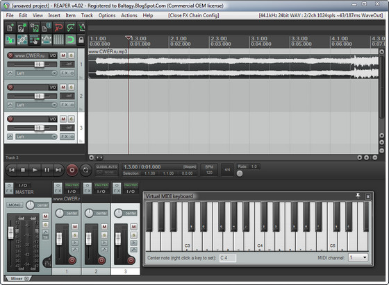 REAPER - компактный аудиоредактор для создания, редактирования и записи многоканальных аудиотреков с возможностью обработки каждого трека по отдельности. REAPER позволяет применять во время обработки аудио множество эффектов, поддерживает технологии ASIO, Kernel Streaming, WaveOut и DirectSound воспроизведение и запись. Поддерживает работу с файлами в форматах WAV, OGG, MP3, MIDI (чтение) и WAV, MIDI (запись), управление уровнем громкости, изменение границ трека, допускает многоуровневый откат/повтор выполненных операций и многое другое.