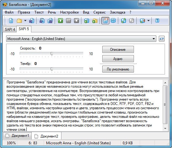 Текст может быть сохранен в вида аудиофайла (поддерживаются форматы WAV, MP3, OGG и WMA). Программа умеет работать с различными версиями пакета речевых функций Microsoft Speech API (SAPI). Он позволяет изменять скорость и тембр речи.