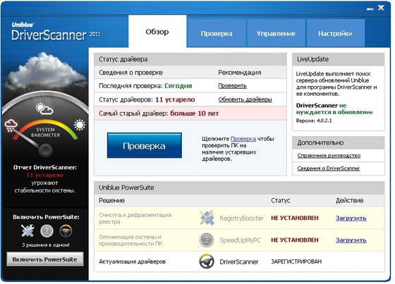 DriverScanner 2011 - разработка от известного разработчика программного обеспечения, необходимая буквально каждому пользователю. Данная программа является действительно нужным инструментов для вашей системы. Служит для поиска и загрузки отсутствующих или последних версий драйверов системы. Самостоятельно просканировав вашу систему, программа найдет отсутствующие или устаревшие драйверы и позволит вам скачать их обновленные версии. Также программа позволяет пользователю сделать резервную копию ваших системных драйверов и в случае краха системы или неполадки какого-либо оборудования после обновления драйвера, восстановит систему в рабочее состояние. Как и многие другие продукты данного разработчика, программа имеет приятный и понятный пользовательский интерфейс, имеет поддержку на совместимость с 32-битной версией операционной системы Windows Vista.