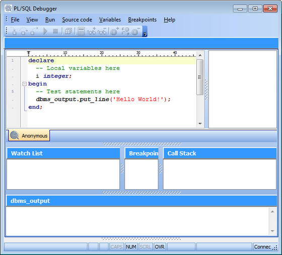 KeepTool PL/SQL Debugger gives you, the PL/SQL developer, all you need to test and debug code. You can set breakpoints and define watches for variables. Breakpoint lines are color-coded and can be removed or reset at will. In addition to the source display, there are separate windows that display watched variables, breakpoints and the call stack.PL/SQL Debugger has been designed with the same emphasis on usability as Hora. This ensures that both tools are closely integrated. Using Hora and the Debugger together, you will be on your way to creating to creating efficient PL/SQL code.