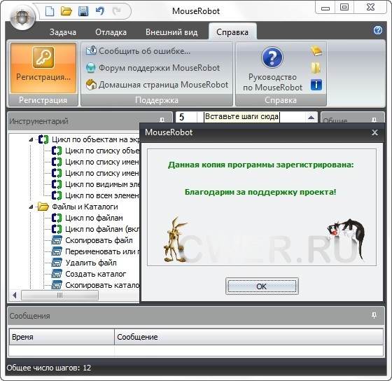 MouseRobot добавляет визуальную запись макросов в любую программу. Вам не потребуется беспокоиться о сложностях автоматизации, изучать программирование и внутреннее устройство программ. Создание макроса состоит из простых и привычных шагов - запуск программ, работа с объектами на экране, нажатие кнопок клавиатуры и мыши.