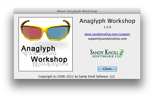 Anaglyph Workshop - программа для создания анаглифических (стерео) изображений. Анаглифы можно создавать как из обычной картинки, так и из пары отдельно снятых кадров. Поддерживается применение карт глубины изображения, которые могут быть созданы при помощи встроенного инструмента. Изображения могут быть экспортированы в различные форматы изображений и в QuickTime.