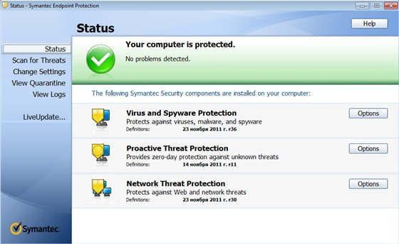 Symantec Endpoint Protection - объединяет Symantec AntiVirus и усовершенствованное средство предотвращения угроз, обеспечивая непревзойденную защиту переносных и настольных компьютеров, а также серверов от вредоносных программ. Программа предоставляет не только передовую в отрасли антивирусную защиту, но также основанную на сигнатурах защиту от программ-шпионов. Это решение также обеспечивает предотвращение угроз, что позволяет защитить конечные точки от целенаправленных и неизвестных атак.
