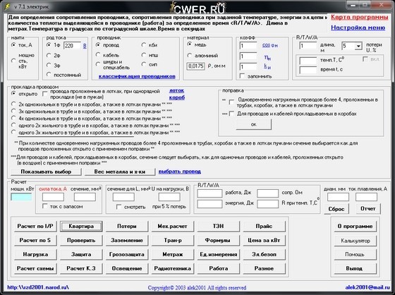 - выбрать сечение провода, кабеля, шнура и спецкабеля при определенной прокладке и потерю напряжения для проводников до 1000 В при определенной длине;