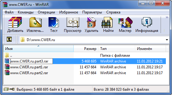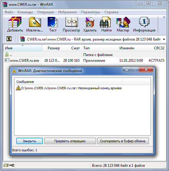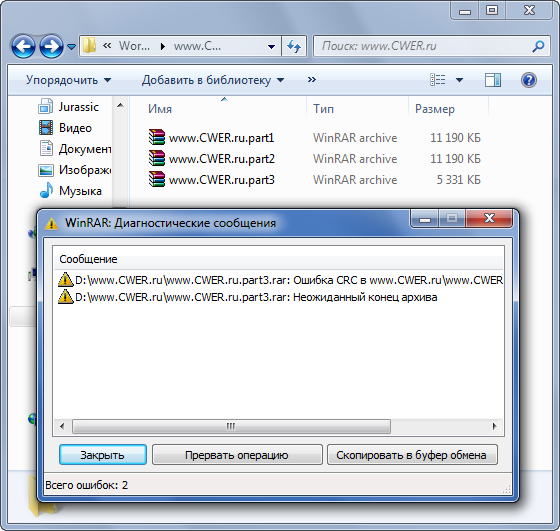 Параллельно мы рассмотрим другой сценарий и на его примере узнаем, как пользоваться информацией для восстановления архива. Вы долго и упорно качали нужную программу или игру в архиве, разбитом на части. Как обычно, щелкаете правой кнопкой мыши на любой части и выбираете "Извлечь", но не тут-то было: архиватор ругается на ошибку CRC и неожиданный конец архива, а именно 3-й его части. Обратите внимание, что в сообщении всегда содержится "имя" битой части, запомните его.