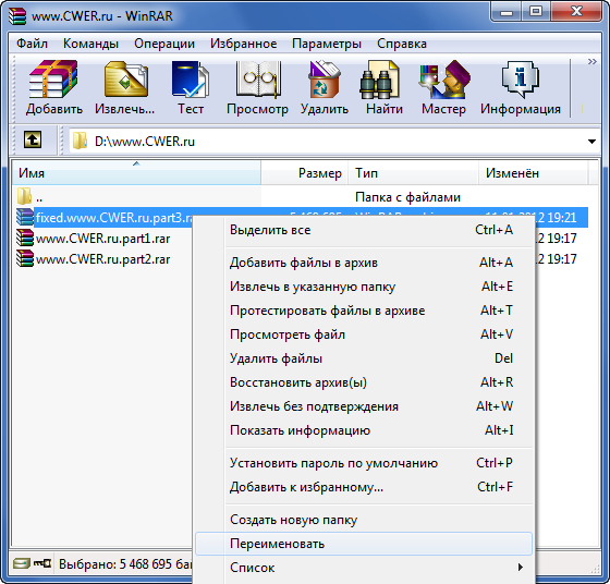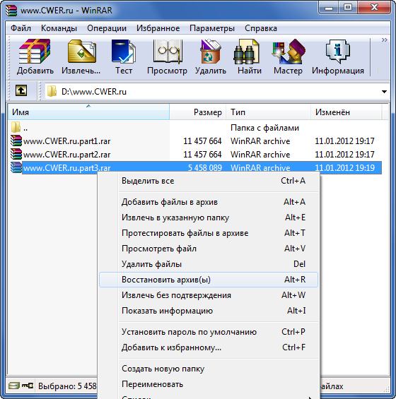 Чтобы исправить архив, запустите архиватор (Пуск->Все программы->WinRAR->WinRAR). Найдите скачанные файлы, щелкните правой кнопкой мыши на битой части и выберите пункт "Восстановить архив(ы)".