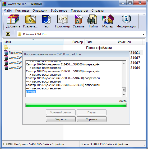 Восстановленный архив появится в той же папке, что и поврежденный, но под другим именем.