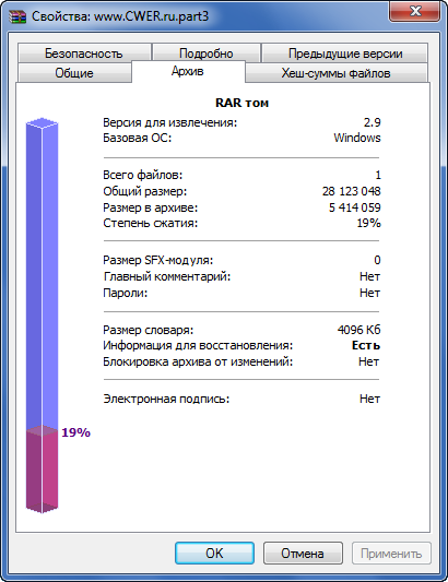 Сперва проверим наличие информации для восстановления. Для этого щелкаем правой кнопкой мыши по битому архиву, выбираем пункт "Свойства", затем вкладку "Архив".