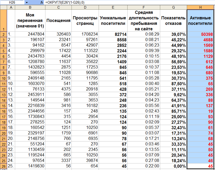Экспортируем отчет в формат, совместимый с Microsoft Excel, и добавляем в него столбец "Активные посетители", значение каждой ячейки которого вычисляем по формуле, указанной в строке формул: