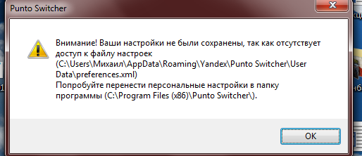 профилем. Удалите ее. Затем подтвердите заново настройки программы. В результате "preferences.xml" должен остаться в Punto Switcher\Data\Punto Switcher\User Data, т.е. в папке директории самой программы, а не в папке настроек программ пользователя (у Вас могут быть другие пути расположения "preferences.xml", в зависимости от оси и типа установки). Возможно "preferences.xml" придётся переместить из "Yandex" в папку директории программы перед удалением папки "Yandex".