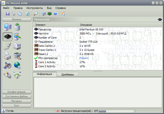 Утилита PC Wizard предоставляет обширную информацию обо всех компонентах, установленных в ваш компьютер. Поддерживаются практически все существующие процессоры, чипсеты, материнские платы, память, устройства для чтения, записи и хранения информации и т.д. Кроме того, в PC Wizard встроено несколько приложений для тестирования быстродействия процессоров, жестких дисков и CD/DVD-приводов. В программе присутствуют опции по предоставлению информации о XP SP2 Center Security (Firewall, Updates, AntiVirus Protection, Remote Ports).