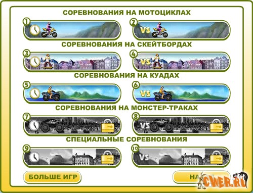 Ещё одна флешка. Примите участие в гонках мотоциклов, монстертраков, куадов или скейтбордов. Завершите каждый уровень без падений. Играйте в одиночном режиме или против компьютера.