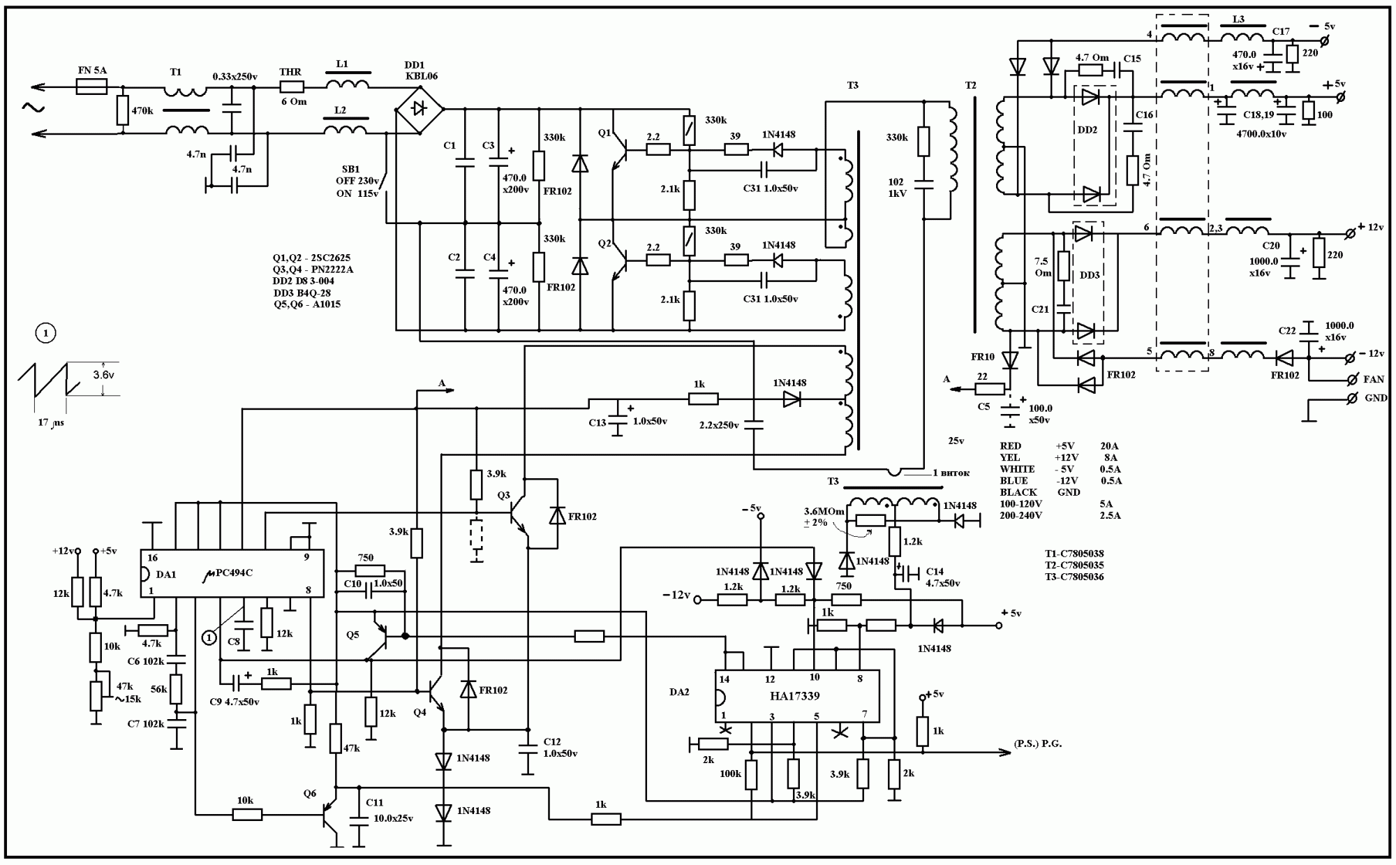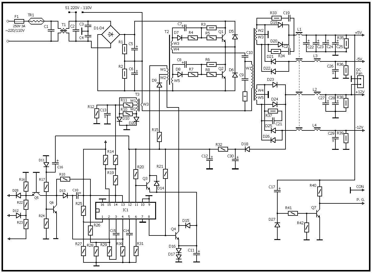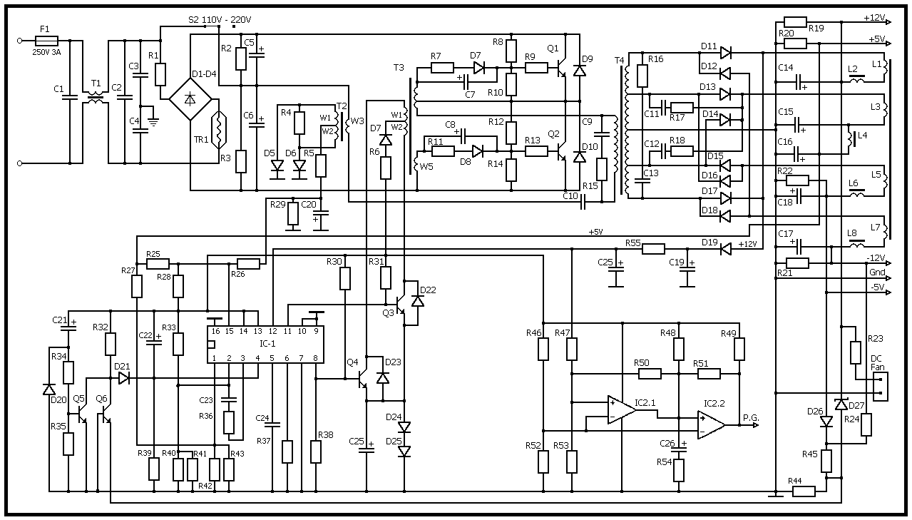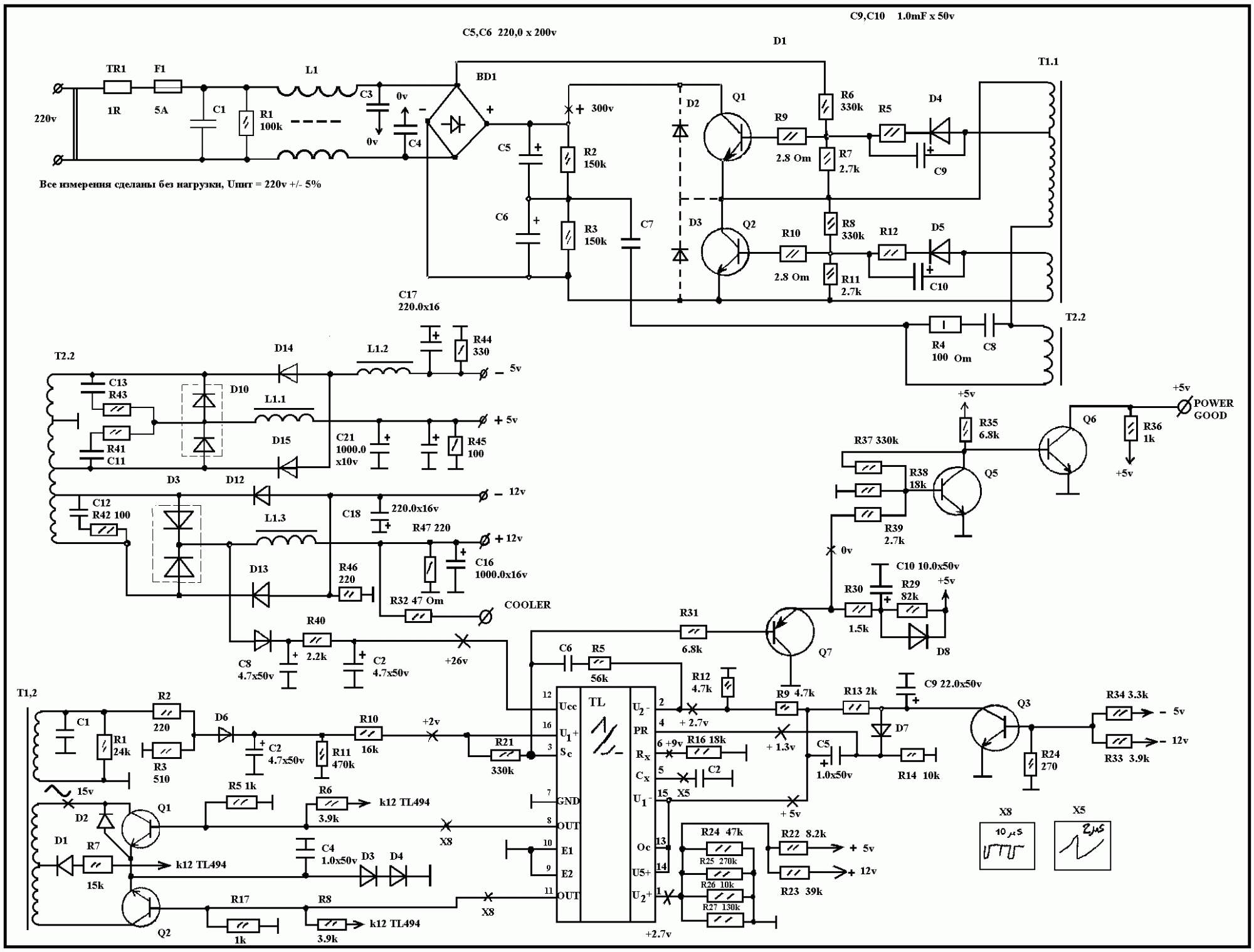 После разборки БП прозвонить на короткое замыкание ключевые транзисторы (типично BUT11A), резисторы на 1..3 ом в базе их на обрыв, мост на короткое/обрыв, пред-выходные транзисторы на кз/обрыв, диоды во вторичных цепях на пробой. В качестве пред-выходных при замене можно ставить наши КТ315, выходные или наши КТ872, КТ8114 (но тогда для самозапуска возможно потребуется снижение номинала резисторов между базой и коллектором их до 200к...150к), или импортные: 2SC3447, 2SC3451, 2SC3457, 2SC3460(61), 2SC3866, 2SC4706, 2SC4744, BUT11A, BUT12A, BUT18A, BUV46, MJE13005 После замены неисправных деталей проверить исправность микросхемы ШИМ TL494 или ее аналога, если определено что она неисправна - заменить. Желательно для профилактики убрать переключатель 220/120в. При включении в сеть для проверки, необходимо вместо предохранителя включить лампу накаливания 100вт 220в, а в выходную цепь +5в резистор 2...5ом 20вт