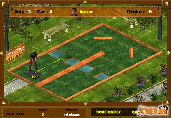 Очередная реализация игры в гольф во флеше. Весьма неплохие графика и физика! Четыре разных персонажа, одиночный или парный режимы. Есть возможность сохранения игры. Восемнадцать полей с разнообразными препятствиями (вода, песок, горки и т.д.).