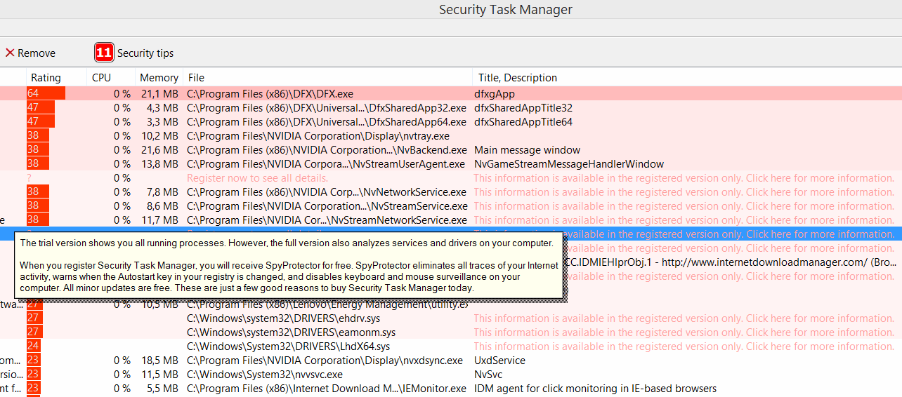 Security Task Manager обнаруживает также виртуальные драйвера программ, обслуживания, BHO или обработки скрытые от менеджера задач Windows.