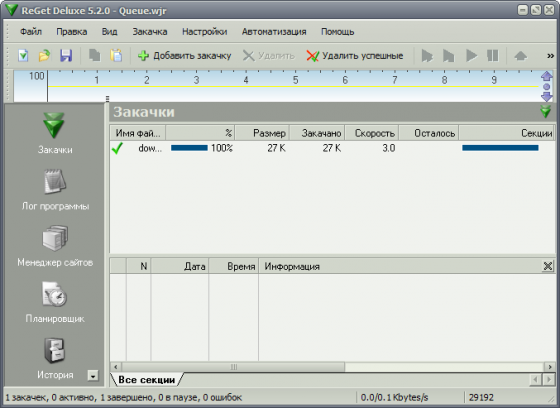 ReGet Deluxe - менеджер закачек для опытных пользователей.Программа поддерживает докачку, разбиение файлов для многопоточной загрузки, поиск файлов, работу с прокси, мониторинг кликов в браузере и буфере обмена (включая формы и скрипты-редиректы), пакетную загрузку, NTLM аутентификацию. Помимо перечисленного, в ReGet Deluxe имеется программа автодозвона, функция резервирования места на диске для целого файла в момент начала закачки, утилита MSIE Spy (позволяющая узнать реальные URL всех загружаемых броузером файлов), планировщик задач и браузер для просмотра FTP сайтов, ведутся логи и мониторинг трафика, есть возможность работы с макросами и антивирусным ПО. Русский язык интерфейса есть.