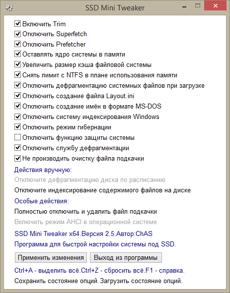 Описание опций SSD Mini Tweaker: