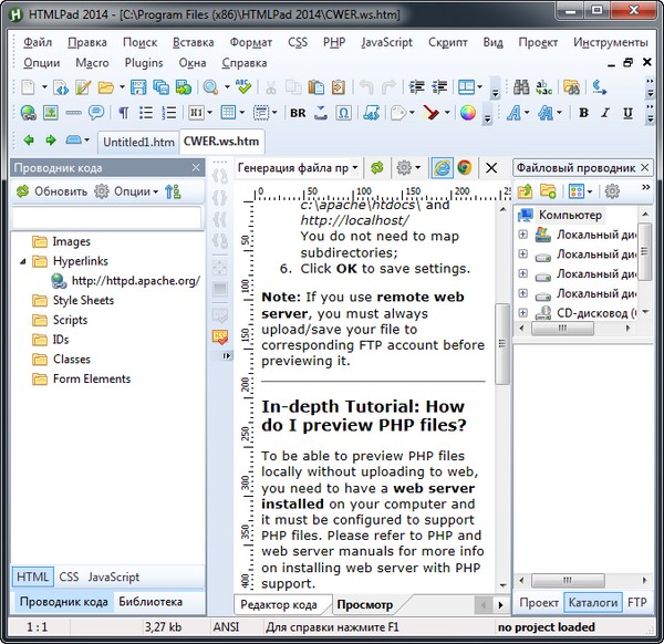 HTMLPad - функциональный и одновременно компактный веб-редактор, имеющий удобную панель инструментов для быстрого форматирования текста, создания форм, таблиц, вставки тэгов, причем не только HTML, но также JavaScript, ASP и SSI. В программе есть обширный набор инструментов для подбора цветов, работы со шрифтами, структурирования текста и т.д. Из полезных дополнений можно отметить функцию проверки кода HTML, простой, но удобный FTP-клиент и расширенный Буфер обмена. Редактор обладает функцией контекстной подсветки вводимого кода. В программе имеется «джентльменский набор» наиболее часто необходимых Java-Script и блоков HTML-кода (навигационная панель; ссылка для возврата к предыдущей странице; кнопка для закрытия текущего окна). Для просмотра редактируемого документа можно использовать встроенный браузер.
