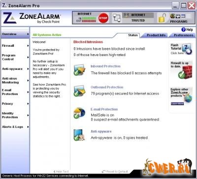 Перекрывает выход в Интернет шпионским программам для пересылки личной информации. Защищает программы и операционную систему от вредоносного программного обеспечения и пр. Как необязательное дополнение в ZoneAlarm Pro встроена антивирусная Anti-Spyware программы. Интерфейс хоть и на английском языке, но интуитивно понятен и позволяет даже новичку легко освоить основные возможности файерволла, а для специальных настроек и требований имеется апплет "эксперт".