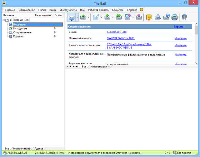 Уважаемый Кролик! Замучил меня один вопрос:не смотря на то, что резервное копирование у меня отключено, копия создаётся, причём, в самый неподходящий момент. Копия находится по адресу: C:\Users\ИМЯ\AppData\Roaming\The Bat!, где ИМЯ-имя моего СТАРОГО компа, с которого на новом из резервной копии был восстановлен The Bat! Как это побороть? Заранее благодарен.