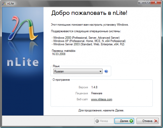 nLite - программа для создания своего собственного инсталляционного диска Windows XP. С её помощью Вы можете создавать диски с уже интегрированными сервис паками, а также с необходимым набором утилит, драйверов, кодеков, антивирусными обновлениями, и многим другим...