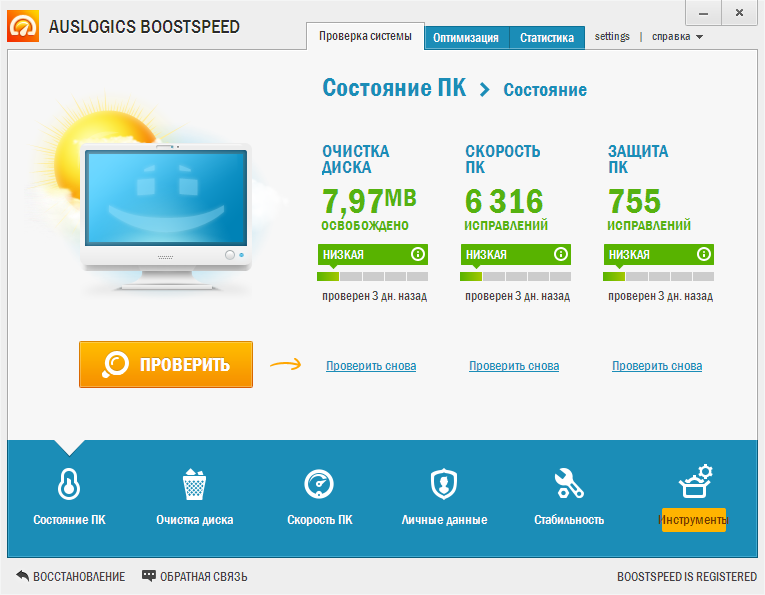 - Удобная навигация. Aбсолютно новый интерфейс BoostSpeed 6 позволяет легко управлять программой. Все утилиты и функции быстро доступны. Основные задачи - очистка дисков, исправление ошибок в реестре, а также дефрагментация файлов могут быть выполнены с помощью всего нескольких кликов мышки! Программа отображает текущее состояние компьютера и, в случае необходимости, предлагает выполнить проверку системы.