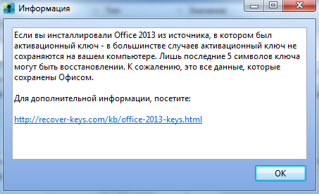Подскажите пожалуйста, какой программой можно вытащить ключ от Microsoft Office 2013. Эта программа нашла только последние 5 символов ключа.