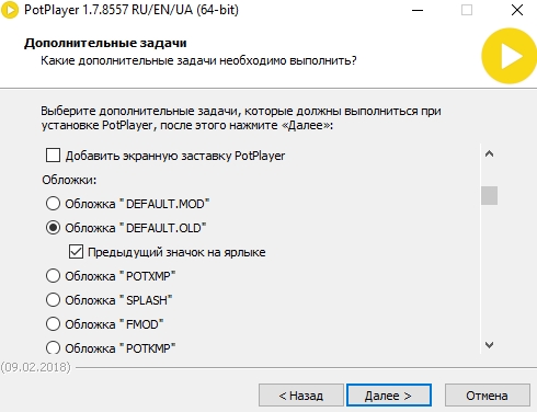 Другие обложки при установке выбрать дает, а "default.old" - нет. Поменять можно только после установки плеера, уже в настройках выбора обложки. Так как в папке скинов "default.old", таки присутствует.