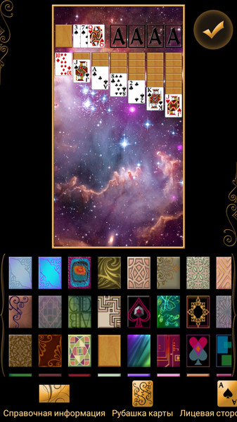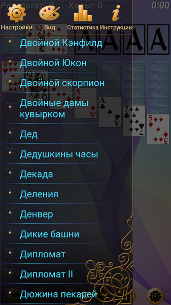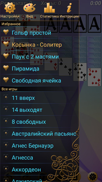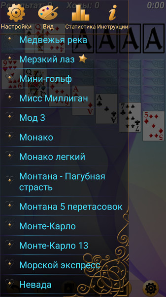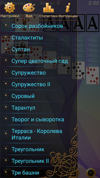 Косынка (обычный пасьянс), Свободная ячейка, Гольф, Кэнфилд, Сорок разбойников, Площадь покера, Боулинг, Пирамида, Три вершины, Паук, Казино Клондайк (пасьянс Вегас), Юкон, Скорпион, Три башни, Суровый, Часы, Расчет, Русский, Китайский, Тузы сверху, Кошка, Осмос, Монте-Карло, Исчезающий крест, Монтана - Пагубная страсть, Красавица Люси, Шкатулка, Воздушный змей, Чередование, Терраса, Уголок королей, Алжирский пасьянс, 8-off, Бристоль, Картинная галерея, Американская жаба, Белая голова, Полумесяц, Осажденный замок, Восточная гавань и многие другие...