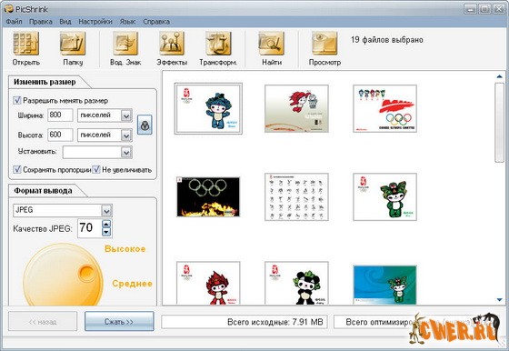 PicShrink – это полезная сервисная программа для цифровых изображений. Запросто сжимает множество форматов изображений (bmp, jpg, gif, png, wmf, emf), используя мощную систему сжатия, уменьшения больших размеров файла ваших изображений, оптимизирования картинок для быстрой загрузки из Web, отправляйте по электронной почте маленькие изображения быстро и не превышая ограничений по отправке вложений. Также к характеристикам относится пакетное преобразование файлов и сервисные программы по добавлению водяных знаков.