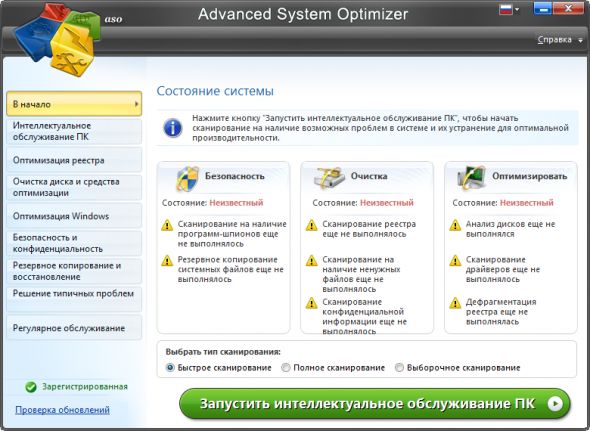 Advanced System Optimizer - программный пакет для настройки и оптимизации работы операционной системы. Это простой и удобный способ для сохранения производительности и надежной работы вашей системы. Программа включает в себя более тридцати различных инструментов для улучшения производительности и ускорения работы вашей системы.