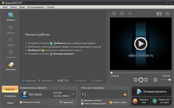 ВидеоМАСТЕР — универсальный видео конвертер с возможностью записи DVD дисков. Программа позволяет быстро конвертировать видео в любой формат, включая ролики высокого разрешения и онлайн-видео. Конвертер включает более 320 готовых настроек видео для мобильных устройств (плееров, телефонов, игровых приставок) и популярных сайтов, таких как YouTube, Vimeo, ВКонтакте и др.