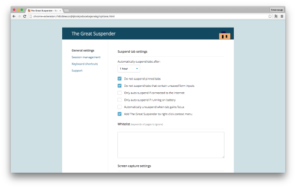 The Great Suspender — расширение для Chrome, которое приостанавливает работу неиспользуемых вкладок браузера. Тем самым решаются две основные проблемы браузера: экономится ОЗУ и снижается энергопотребление.