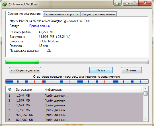 4. Скачивание идет довольно быстро и сразу в несколько потоков.