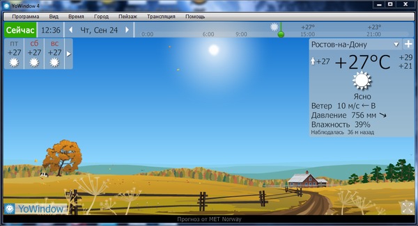 YoWindow - это монитор погоды. Программа отображает пейзаж, изменяющийся в зависимости от погоды, дневного освещения и времени года. Программа исправно отображает все возможные погодные явления: облака, дождь, снег, ветер, туман, грозу, а также солнце, луну и звезды. По сути YoWindow это модель обычного окна. Но в YoWindow у Вас есть возможность перемотать время вперед и заглянуть в будущее - увидеть прогноз погоды в нужный момент времени. В настройках YoWindow можно включить программу в автозапуск, выбрать для отображения информационные панели (интерактивная временная шкала, панель прогноза, инспектор, активировать анимацию погодной картины). Если нас интересует не только температура воздуха, то на экран следует вывести информацию о диапазоне температуры (какая она есть и какая она по ощущению), картинке неба, ветре, давлении, влажности, количестве осадков, видимости, времени восхода и заката, долготе дня и фазе луны. Также настраивается количество дней для отображения прогнозов, пейзаж (по умолчанию это “Деревня”), единицы измерения (фаренгейты, цельсии, мили, метры, узлы и прочее).