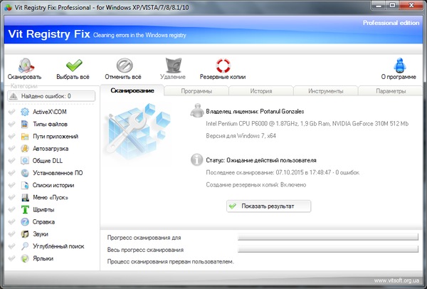 Vit Registry Fix - приложение для устранения ошибок в реестре. Наличие «мусора» и ошибок реестра приводит к снижению общей производительности системы и различным сбоям. Vit Registry Fix находит эти ошибки и сортирует их по категориям (ActiveX\COM,Типы файлов, AppPath, автозагрузка, Shared DLL, Uninstall, History list, меню ПУСК, Шрифты, Справка, Звуки, Ключи Software (Deep scan). Дополнительно ищет нерабочие ярлыки на дисках. Предусмотрена возможность ручного удаления ключей из разделов Software (как для HKCU так и для HKLM), создания списка исключений и резервных копий перед удалением ошибок.