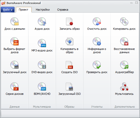 BurnAware Professional — компактная и простая в использовании программа для записи файлов на CD, DVD, Blu-Ray и HD-DVD диски. Поддерживает работу с любыми типами оптических дисков (включая CD-R/RW, DVD-R/RW, DVD+R/RW, BD-R/RE, HD-DVD-R/RW и DVD-RAM) и аппаратными устройствами записи. Есть возможность создания образов, записи мультисессионных дисков, проверки записанного содержимого.