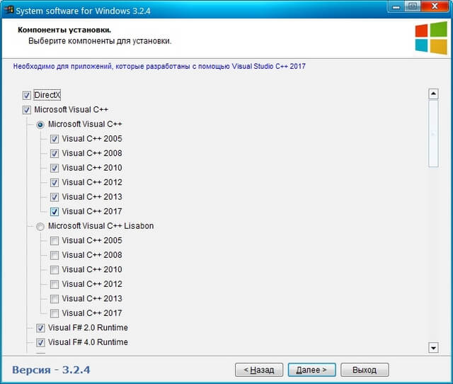 Часто ли у вас не запускается игра или программа из-за отсутствия того или иного системного компонента? Для вас создана небольшая утилита, чтобы автоматизировать процесс установки основных компонентов без которых трудно представить ПК. По умолчанию выбраны компоненты которые обязательны к установке. Установщик предложит только те компоненты для установки которые совместимы с операционной системой, в которой он запущен. Разрядность операционной системы также определяется автоматически. Установщик сам предложит перезапустить систему, если это необходимо для работы компонентов.