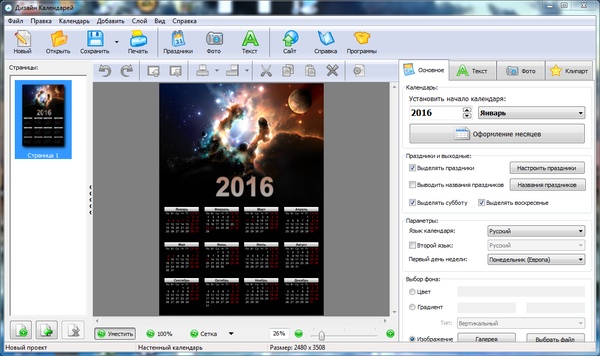 • Вы сможете создавать самые разнообразные календари: карманные, настенные, настольные; на целый год, квартал или на один месяц. Выбирайте любой формат листа, композицию и стиль оформления. Поддерживаются многостраничные календари.